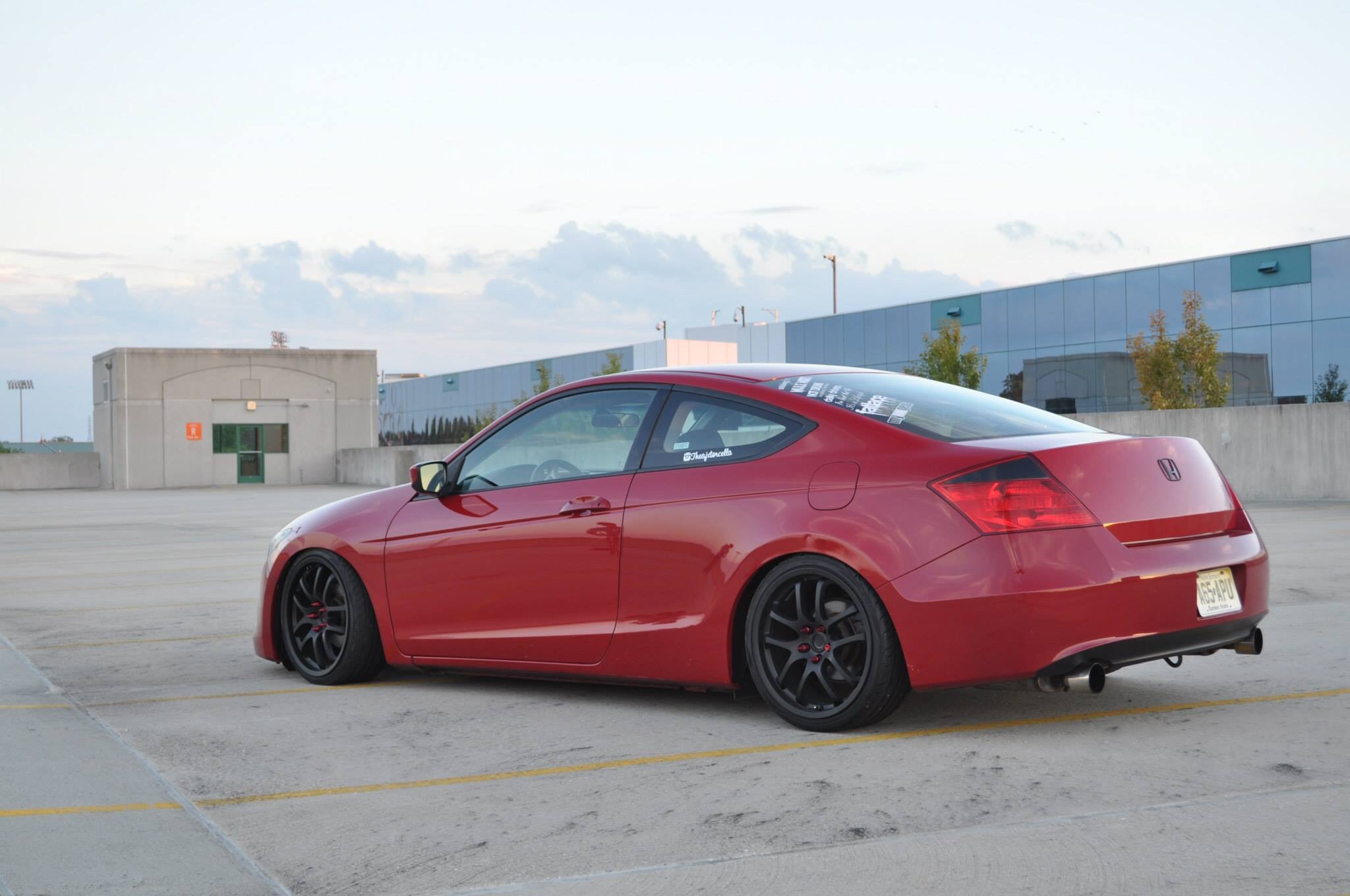 2008 San Marino Red Coupe 2.4l Auto x Custom CBE x Weapon-R CAI x G35 Rays Infiniti Wheels x Ichiban 15mm Spacers Front, 25mm Spacers Rear x Sickspeed Spiked Extended Lugs (Red) x Megan Racing Street Series Coilovers x Nokya Yellow DRLs x Aftermarket Yellow JDM Fogs