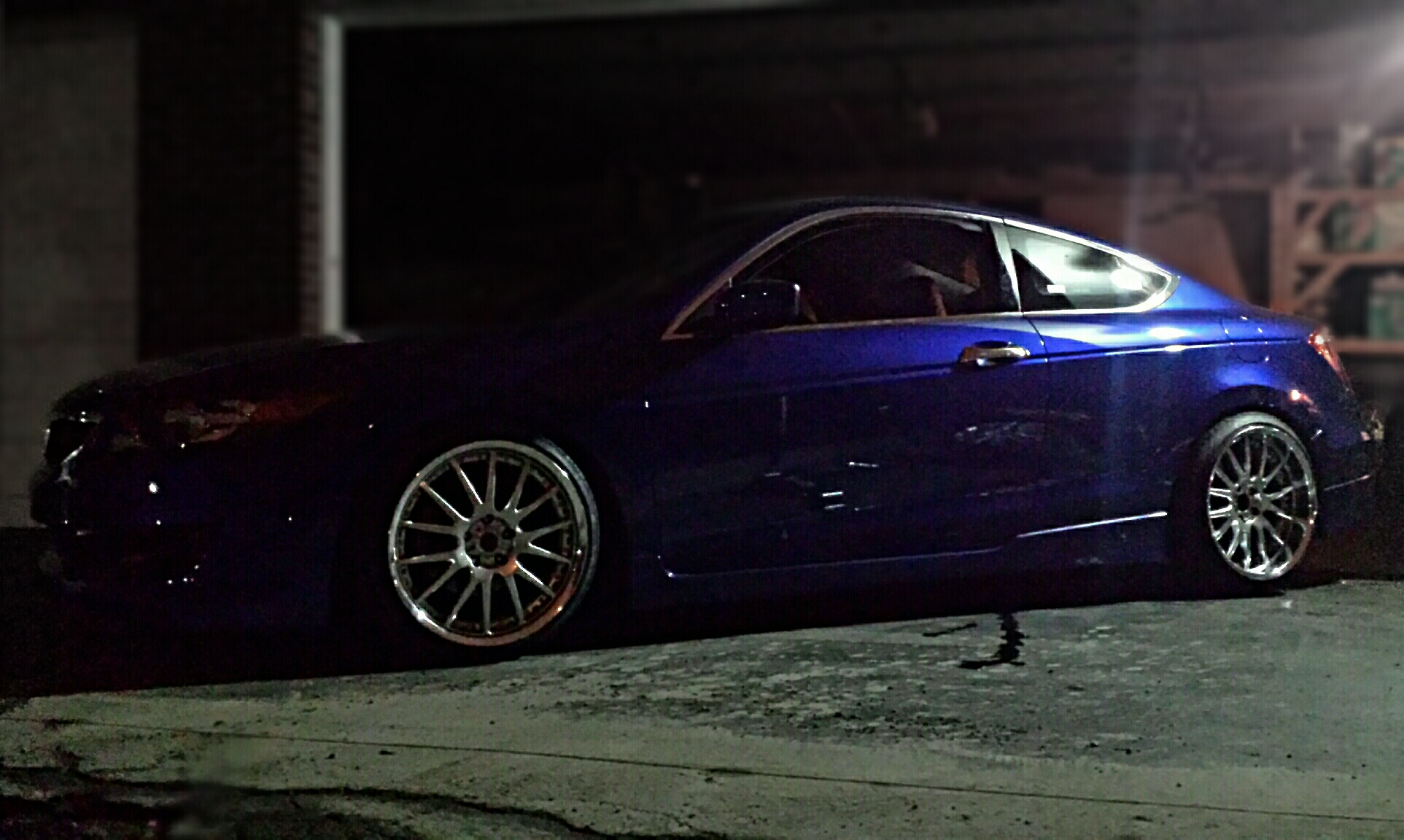 I only took a couple of pictures when I tested them, it was dark so it was hard to get a good shot. Here's another picture I took, I still have to lower it more and adjust my rear camber a little. The lighting makes the rear look like they stick out more than they really do.