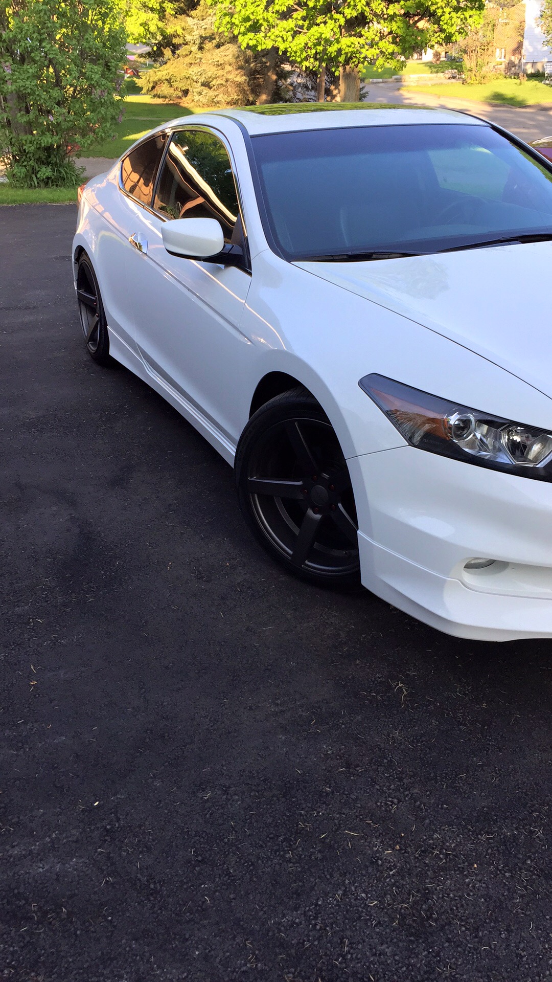 Hello everybody, i had my first accord for a little more than a month now. It's a 2012 6/6 white hfp coupe. It's on 19" ruffino wheels. I love it so far, and looking forward to upgrade the exhaust with j-pipe,precat high flow and cat back. I ve already installed a takeda short ram and shopping for other intake upgrades. Since i ´m from Canada(quebec) i ´m going to cross the border a few times to get evry parts i need and will be often on this forum to get some tips from you guys. Here´s a pic of my car it's not the best pic but i´ll post othersin the futur.