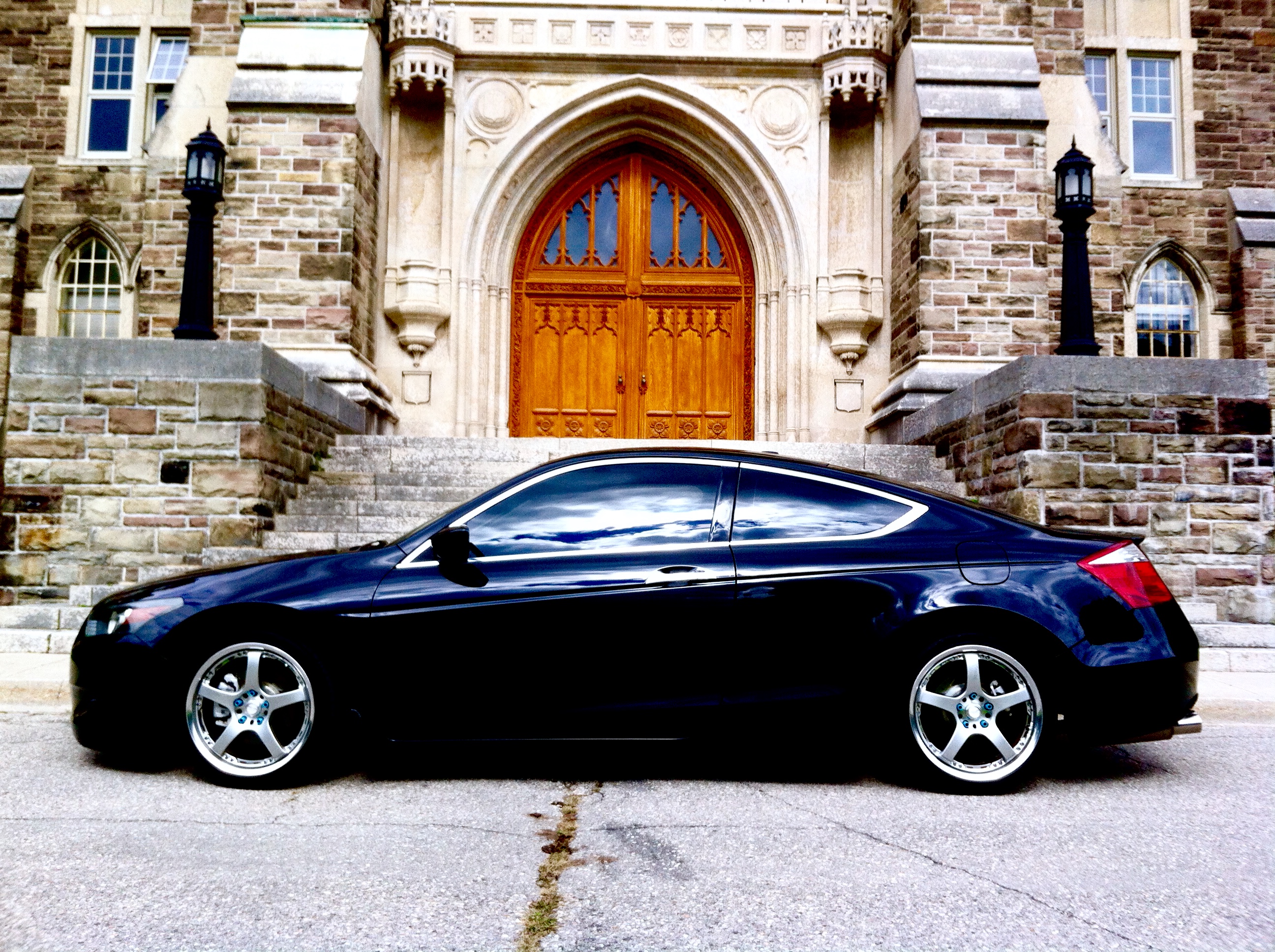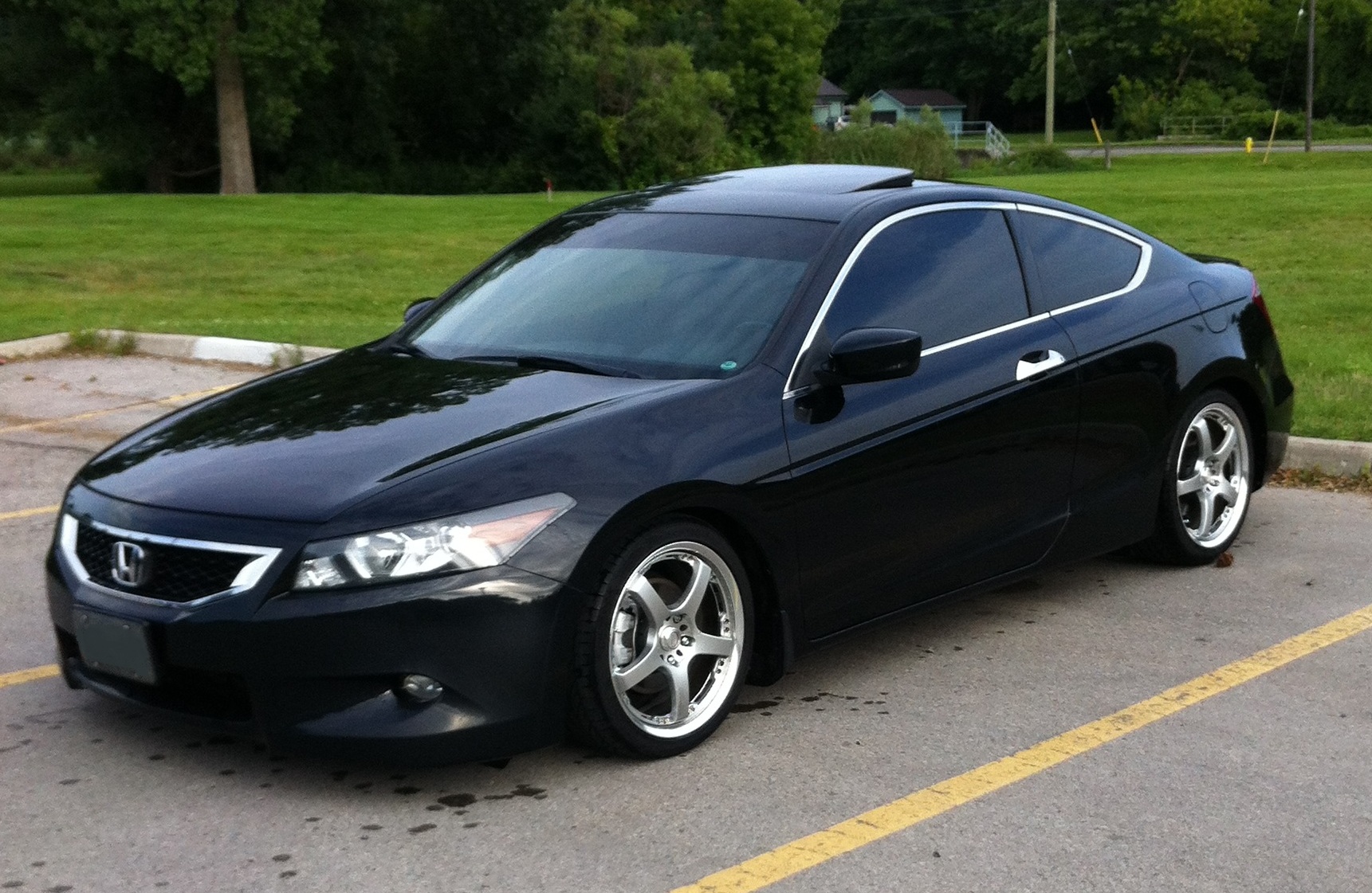 I thought I would introduce myself and my ride. The first car I bought myself was a 2004 Accord LX 4-cyl Sedan. It was a great car and got me through collage. I put a huge sound system in and threw some 20s on it. Looked good but I was wanting something faster. So I traded it in and bought my 2008 EX-L 6-6 Coupe in February of 2012. I laid low with modifications for the first year, but threw on the 20s I had on my previous Accord. Here she is when I picked her up from the dealership.