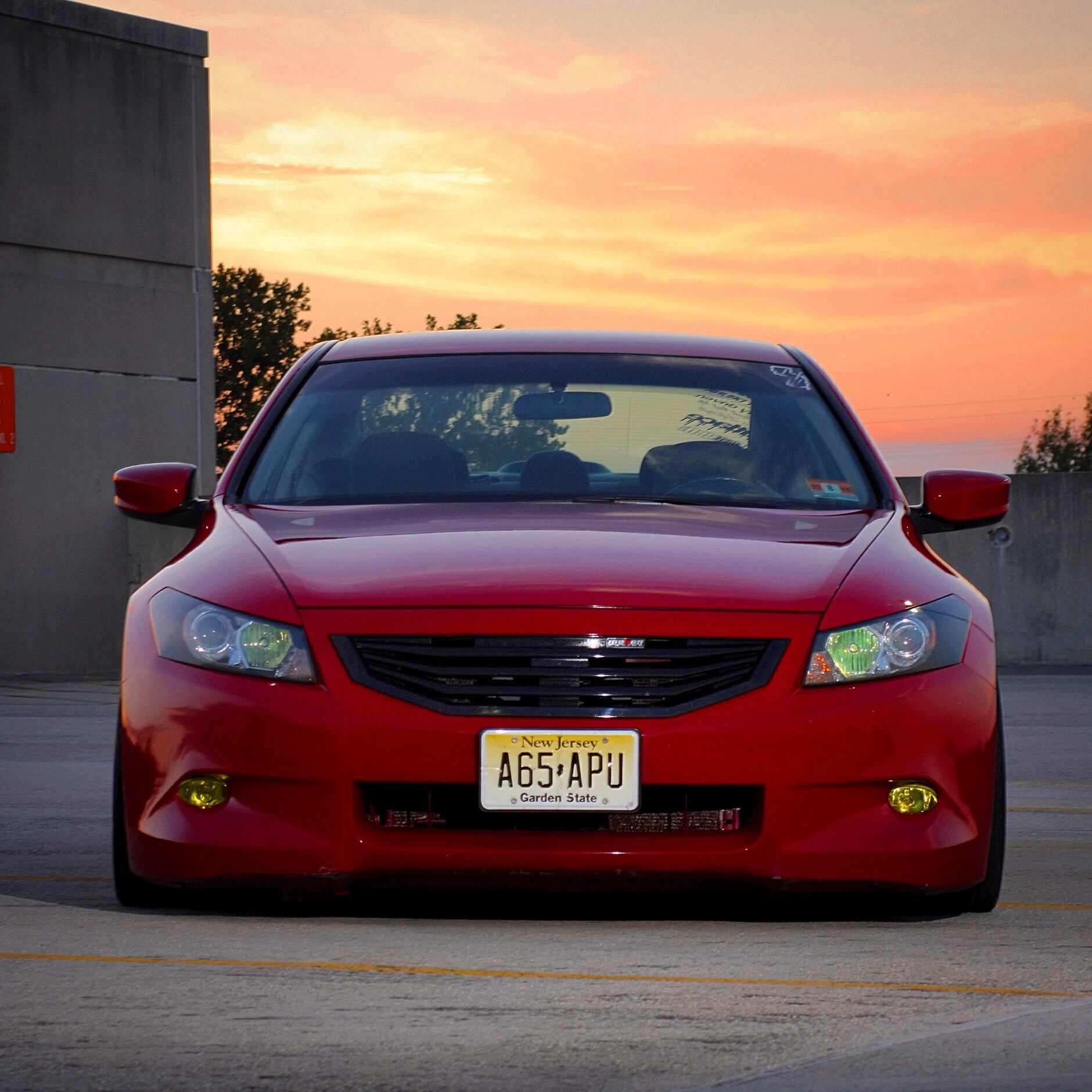 2008 San Marino Red Coupe 2.4l Auto x Custom CBE x Weapon-R CAI x G35 Rays Infiniti Wheels x Ichiban 15mm Spacers Front, 25mm Spacers Rear x Sickspeed Spiked Extended Lugs (Red) x Megan Racing Street Series Coilovers x Nokya Yellow DRLs x Aftermarket Yellow JDM Fogs