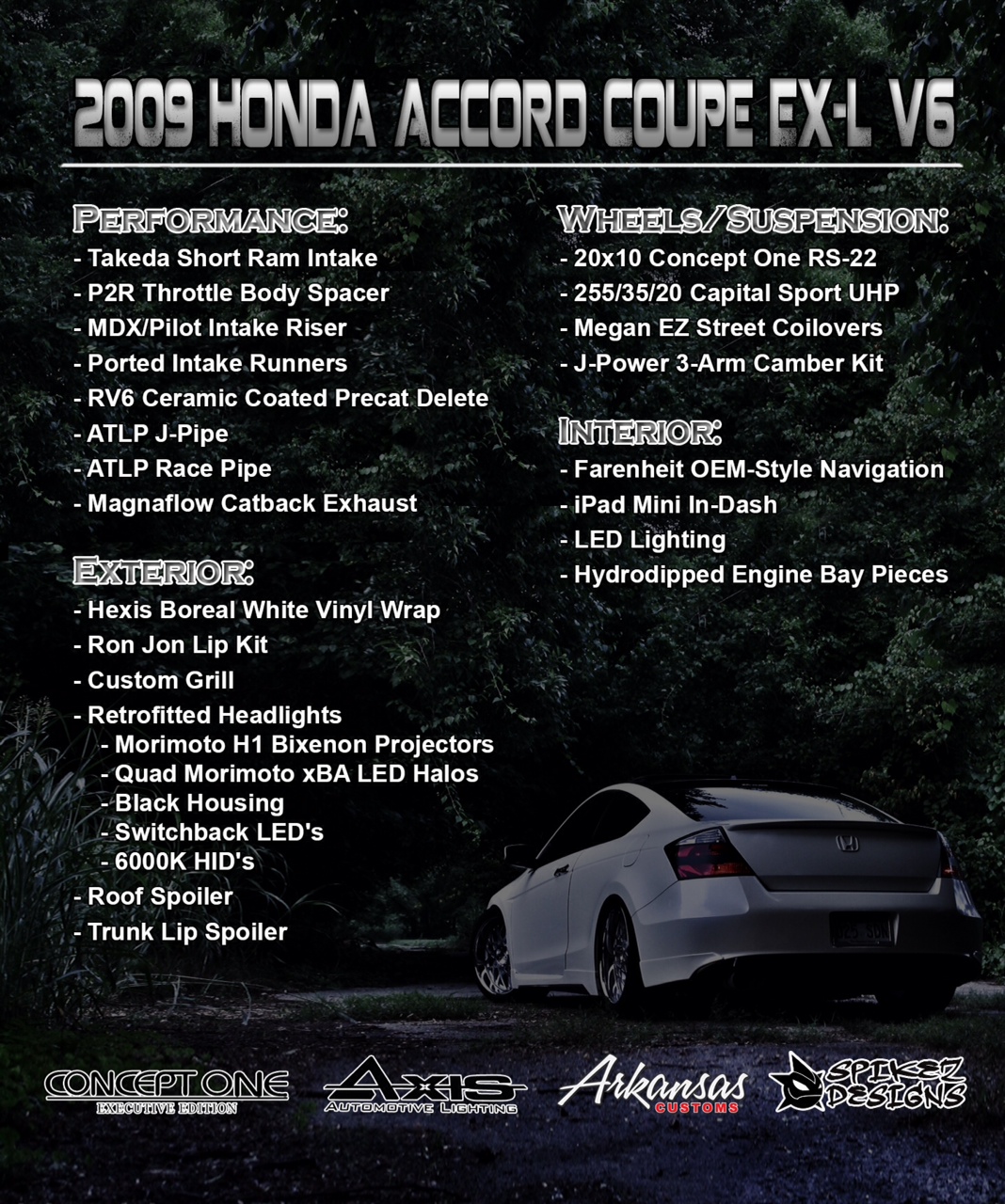 Hexis Boreal White Wrap / 20x10" Concept One RS-22 / Megan EZ'S / J-Power Camber Kit / Quad Retrofitted Headlights/ Morimoto H1 Projectors / Quad Morimoto xBA Halos / 6000k HIDs / White LED Dome/Reverse/License Plate Lights / Switchback LED's / Farenheit Navi / iPad Mini / Roof Spoiler / Ron Jon Lip Kit / Magnaflow CBE / Takeda SRI / ATLP J-Pipe w/ Race Pipe / RV6 Ceramic Coated PCD's / Ported Intake Runners/ Intake Riser / P2R TBS / Hydrodipped engine pieces