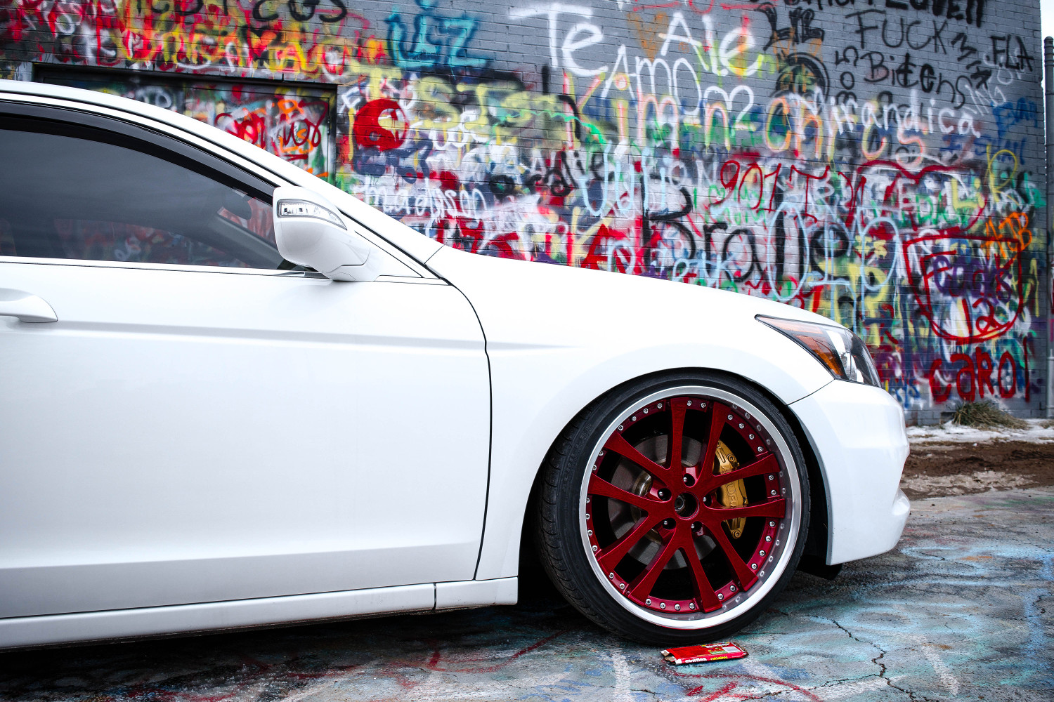 I rode around lowered for a bit, and impulsively bought some wheels. They are Manaray MS-6 Hyper R edition. Don't remember the specs exactly... something like 18x8 18x9 +32ish? While they're definitely cool wheels (I really liked the color), but with them being 17" faces stepped out to 18", they just looked WAY too small for the sedan's huge wheel wells.