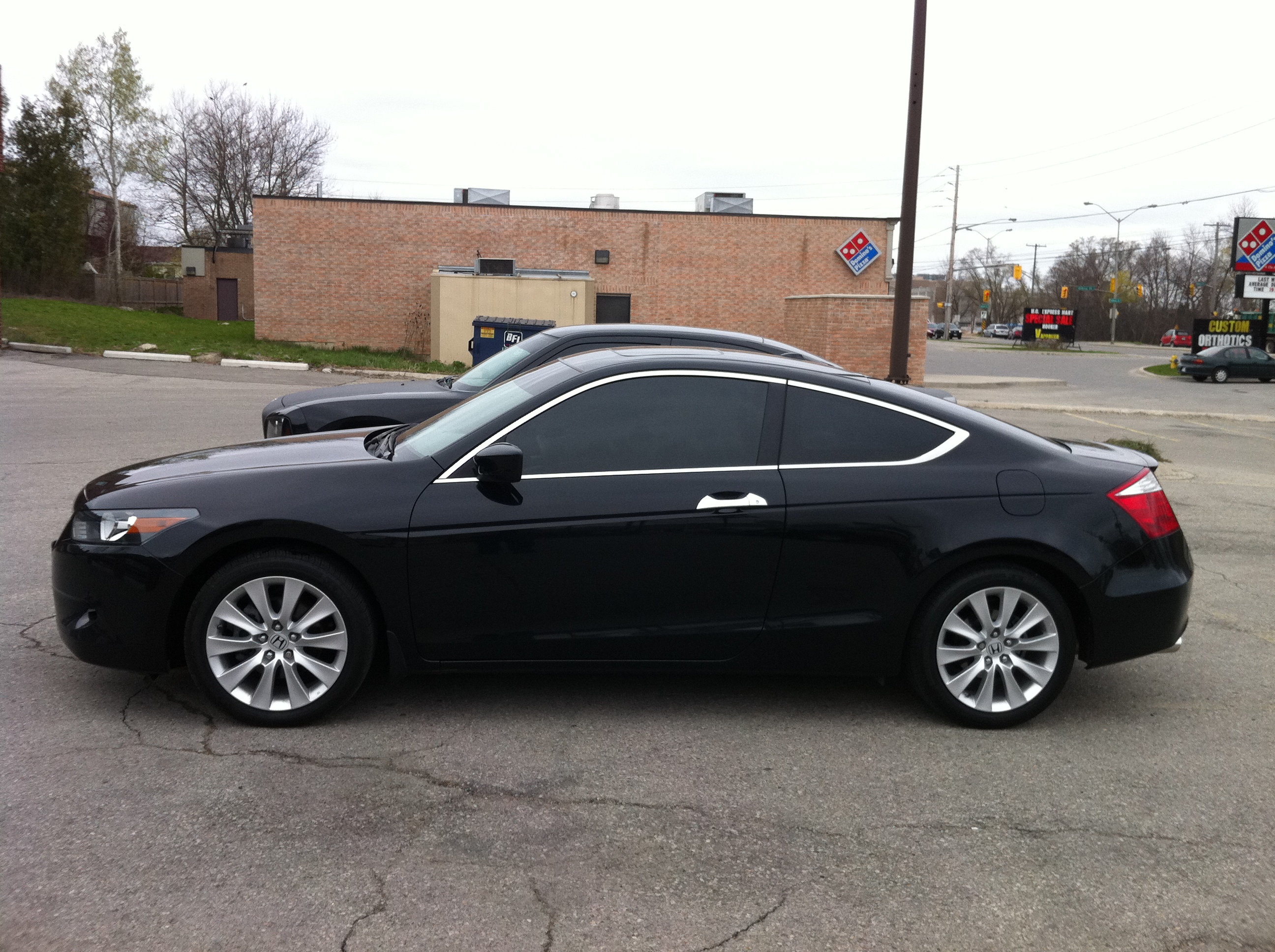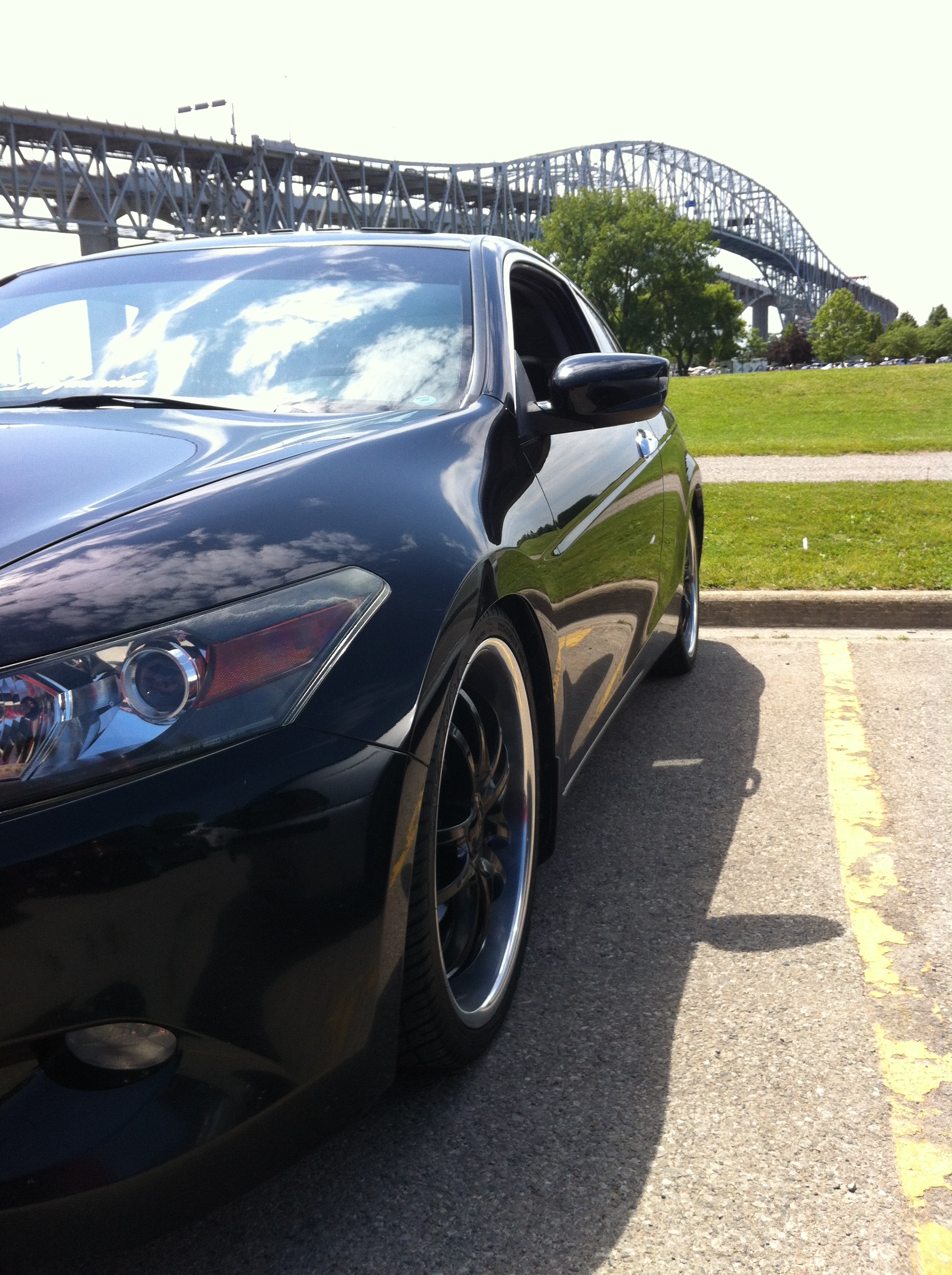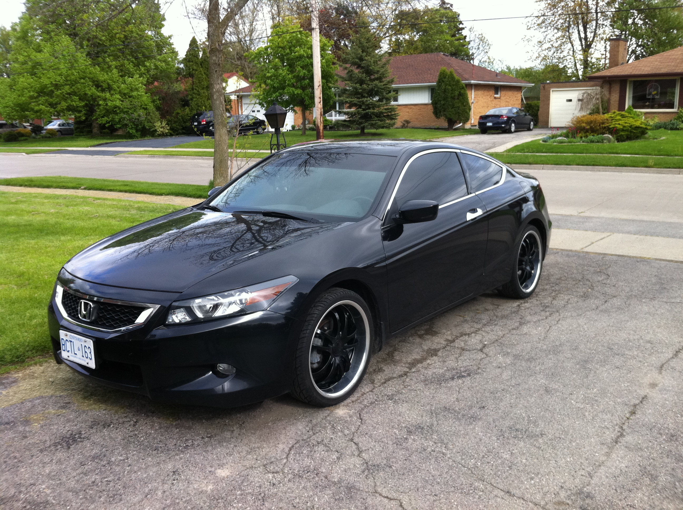 I thought I would introduce myself and my ride. The first car I bought myself was a 2004 Accord LX 4-cyl Sedan. It was a great car and got me through collage. I put a huge sound system in and threw some 20s on it. Looked good but I was wanting something faster. So I traded it in and bought my 2008 EX-L 6-6 Coupe in February of 2012. I laid low with modifications for the first year, but threw on the 20s I had on my previous Accord. Here she is when I picked her up from the dealership.