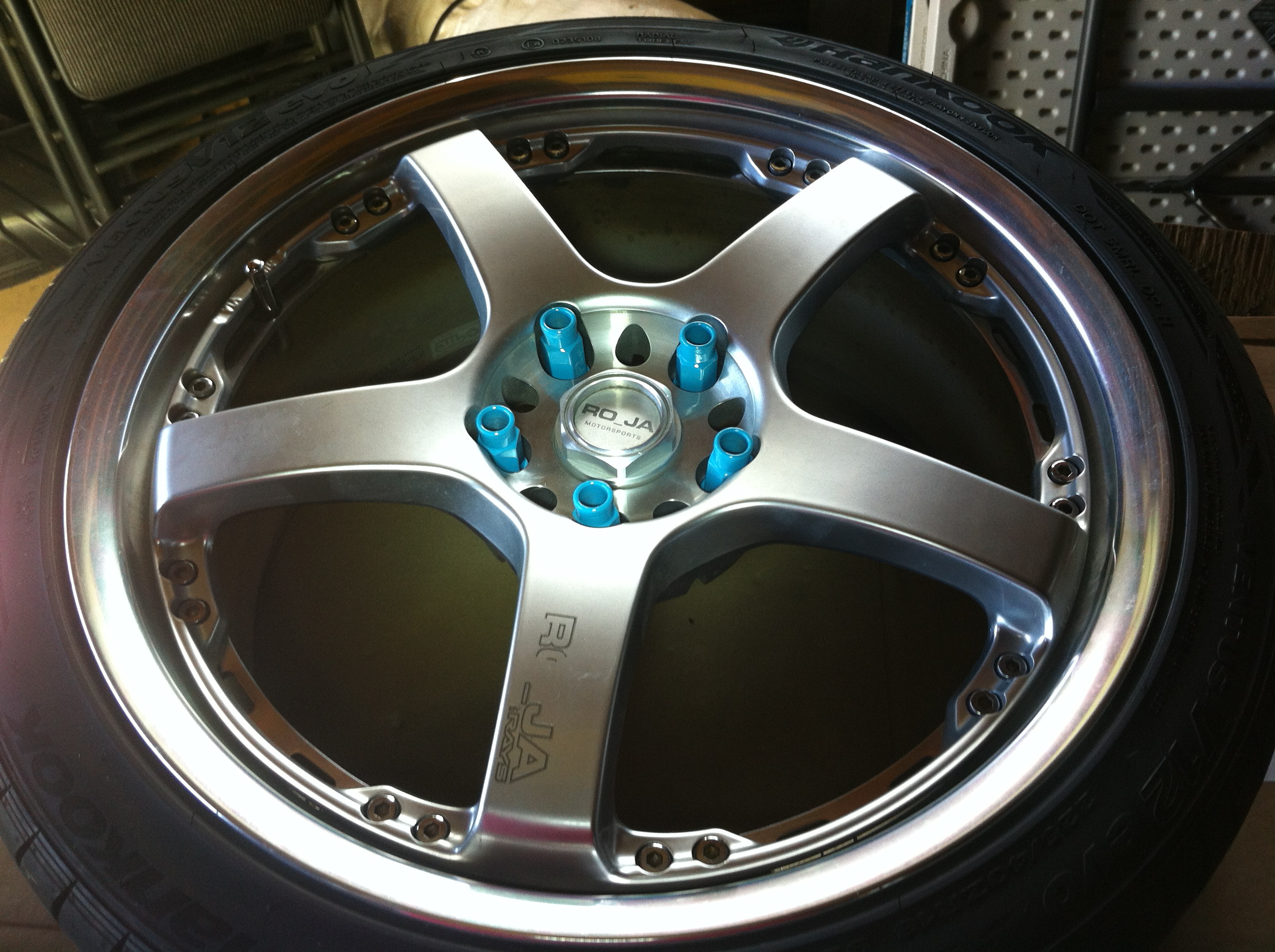 I bought some lightweight rims to reduce some unsprung weight. They are 18x8 +43 Ro_Ja R25 rims made by Rays. They only weight 21 lbs each (without tires). They are wrapped in Hankook Ventus V12 evo tires. I also bought some Function and Forum lugnuts to go with them.