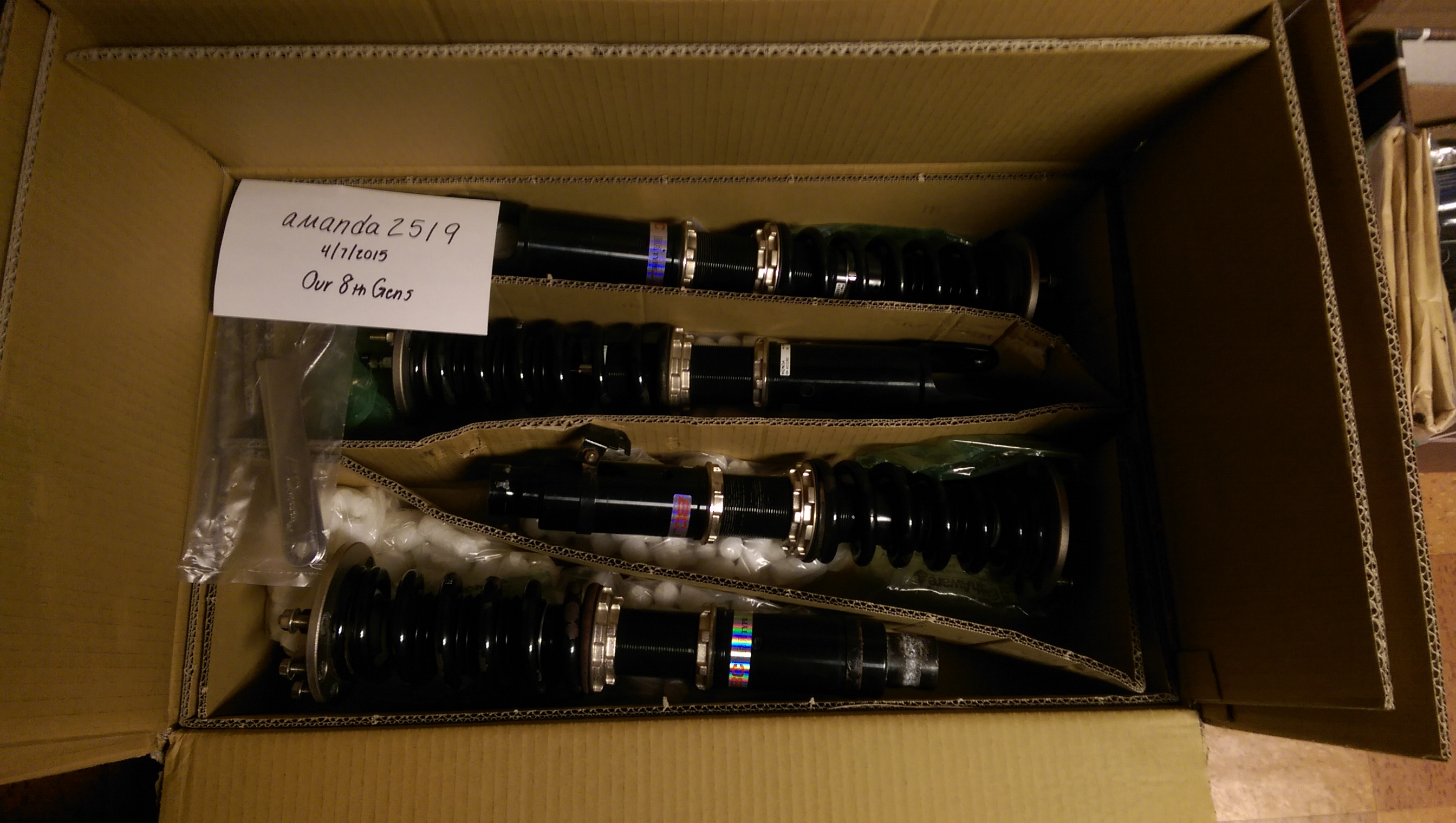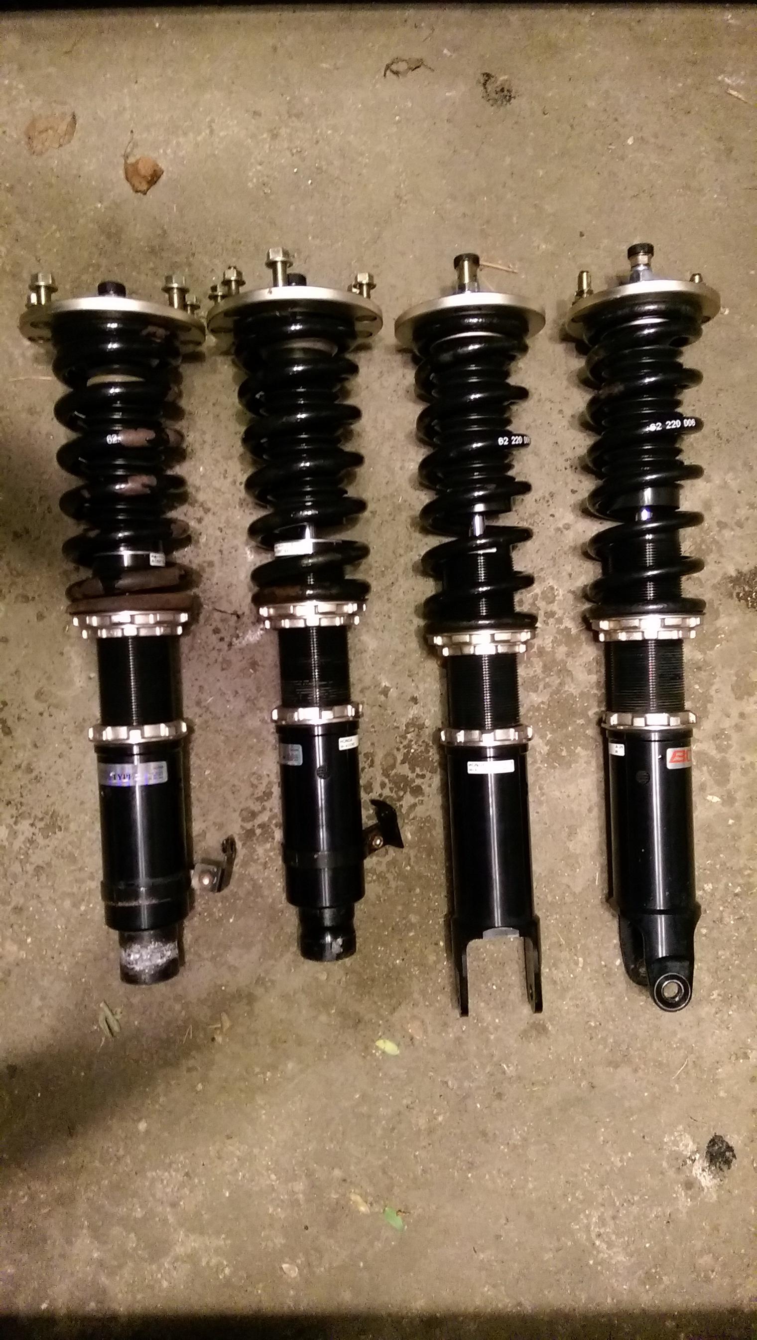 I am selling a used set of BC Racing BR type coilovers for a 2008-2012 Honda Accord (coupe or sedan, I4 or V6) or a 2009-2013 Acura TSX. They have about 40k miles on them and I rarely drove this car during the winter. Both spanner wrenches are included.